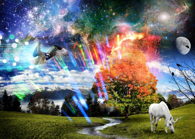 I created this image to depict the struggle between God's creation and man's creation ( Romans 8:20-22 ). The left side of the image contains the tree of life and the river of life which represents Jesus. The birds represent the freedom of God's creation. The light on the left side of the image is brighter than the right side depicting two kingdoms, On the right side of the image there is freedom, but it is not rooted in love as it is birthed out of struggle and strife. The Statue of Liberty represents the freedom the world offers which is no freedom at all considering the lives lost to gain such freedom, and the tank shows this brutal struggle to keep that freedom or to gain it.
